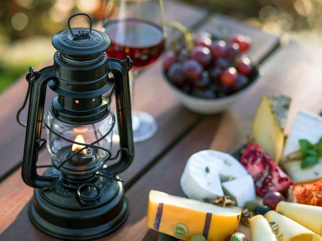 De Feuerhand Stormlamp 276 is een sfeervolle blikvanger in de tuin.