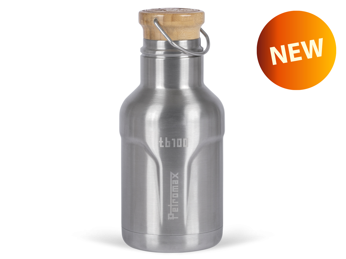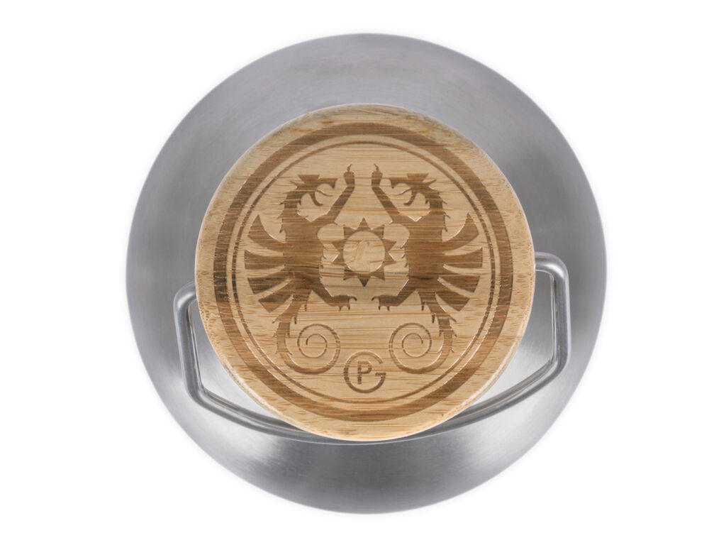 Dubbelwandige thermosfles met bamboe schroefdop en beugel, 1 liter.