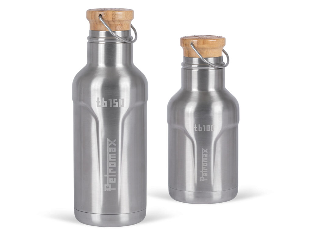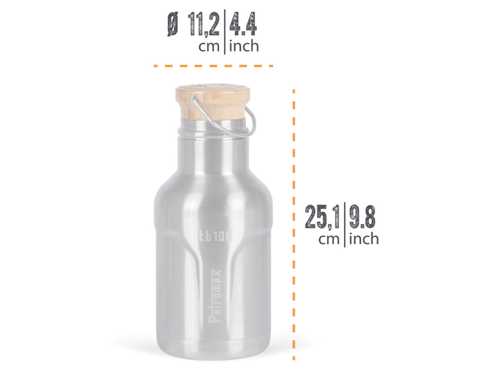 Dubbelwandige thermosfles met bamboe schroefdop en beugel, 1,5 liter. Houdt vloeistoffen warm of koud. Warm houden (inhoud > 50°C)
